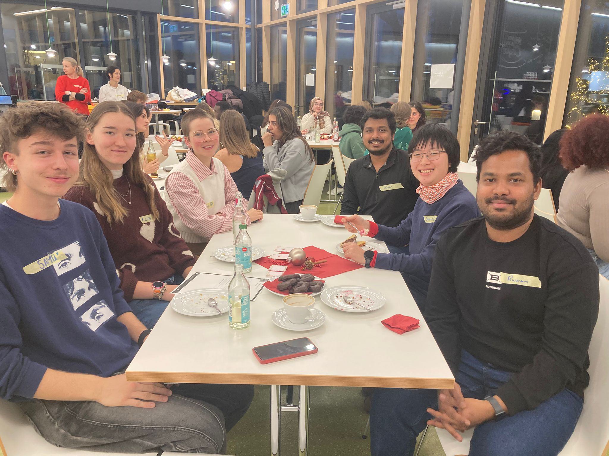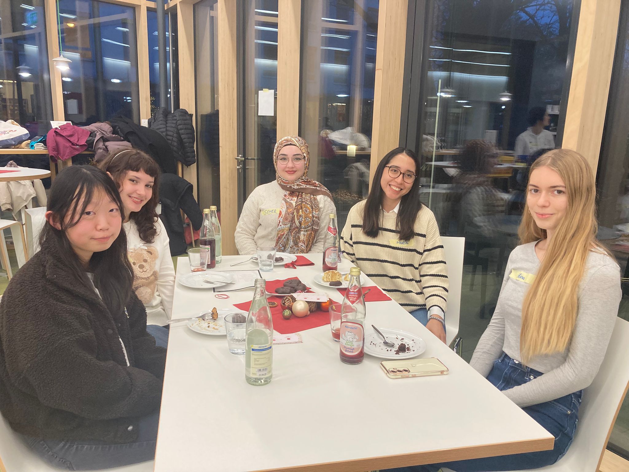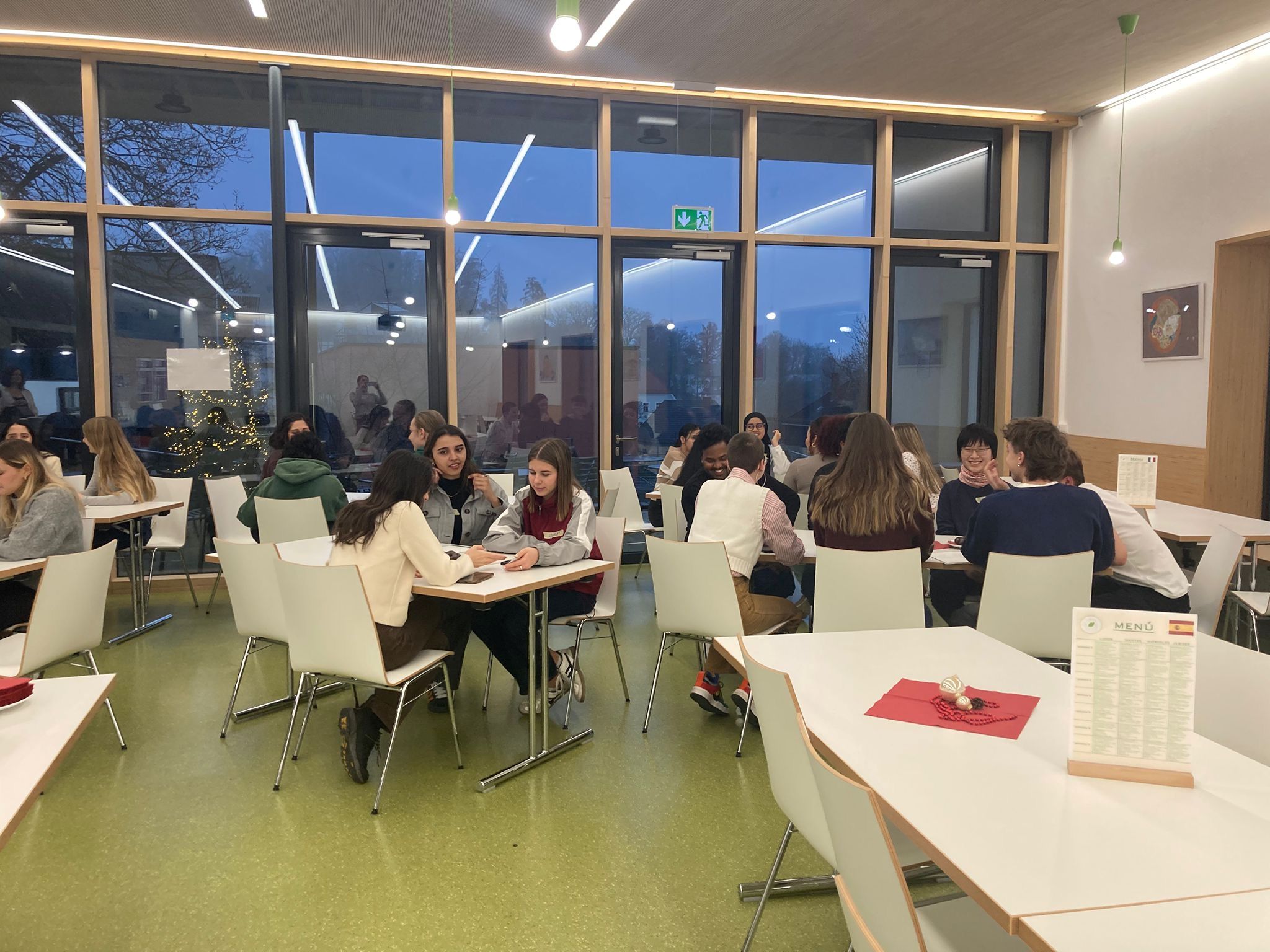 Unter diesem Motto luden die Schülerinnen und Schüler des Leistungsfaches Englisch (Q13) mit ihrer Lehrkraft Bianca Hofmann bereits zum zweiten Mal Studierende des European Campus zu einem Kennenlernen ans Gympan ein. Und so trudelten am 4. Dezember 2025 in der adventlich geschmückten Mensa junge Erwachsene aus der Türkei, Peru, Malaysia, Uganda, Irak, Sri Lanka, Taiwan, Indien und Syrien ein, um mit einheimischen Jugendlichen ins Gespräch zu kommen, die schon ihr Leben lang oder seit Längerem im Rottal leben. Auch dank eines kleinen Warm up-Spiels unterhielten sich alle schnell blendend und man tauschte sich über die Unterschiede im Schulsystem, Weihnachtstraditionen und noch vieles mehr aus. Zusätzlich „versüßt“ wurde der Nachmittag durch die mitgebrachten Kuchen und Plätzchen sowie die heißen und kalten Getränke, um die sich Nicola Dyszak und ihr Gympan Café -Team kümmerten. Den Abschluss bildete ein „Pub Quiz“ in gemischten Gruppen, in dem es allerlei Fragen zu beantworten galt (z.B. Was haben der ehemalige deutsche Kanzler und der Schneemann aus „Frozen“ gemeinsam? ). Für die beste Teamleistung gab es einen kleinen Preis.
